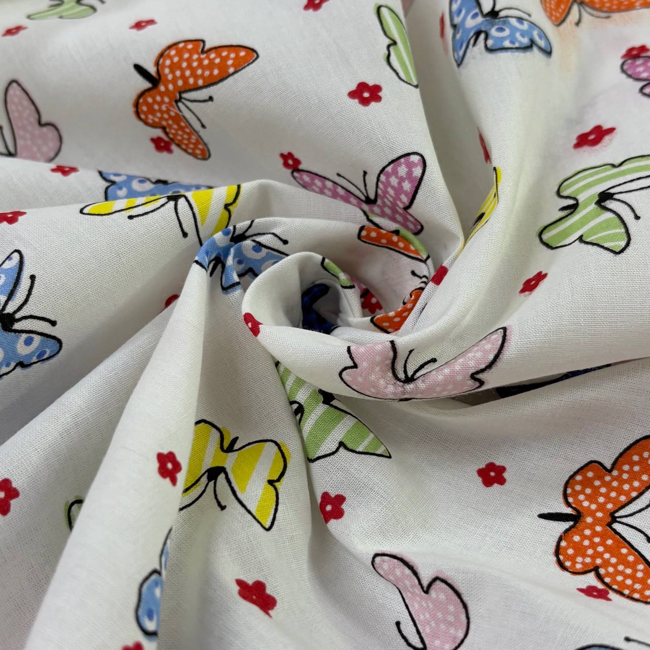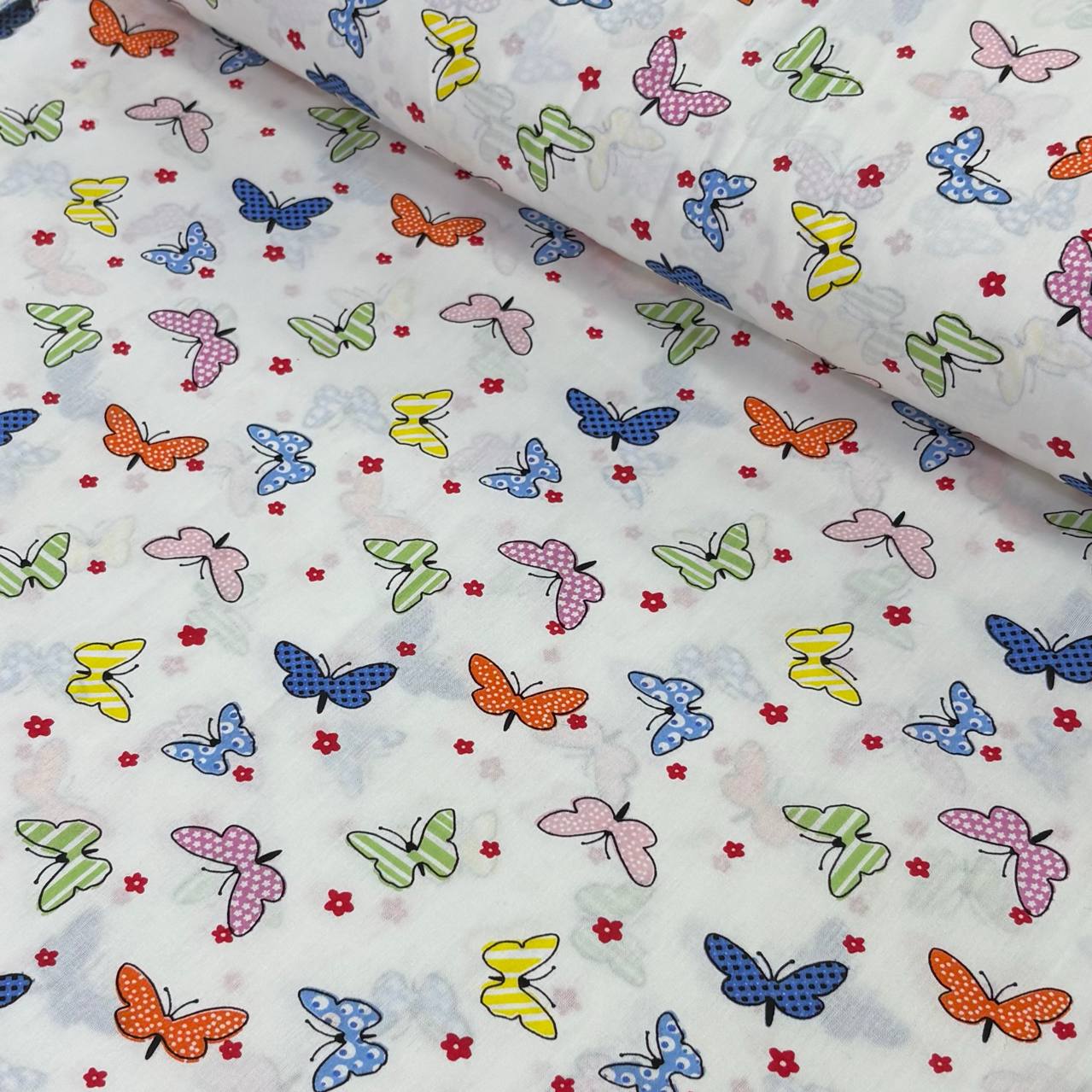 פרפרים קטנים בצבעים שונים – כתום, צהוב, ורוד, ירוק, כחול ,פרחים אדומים על רקע לבן
