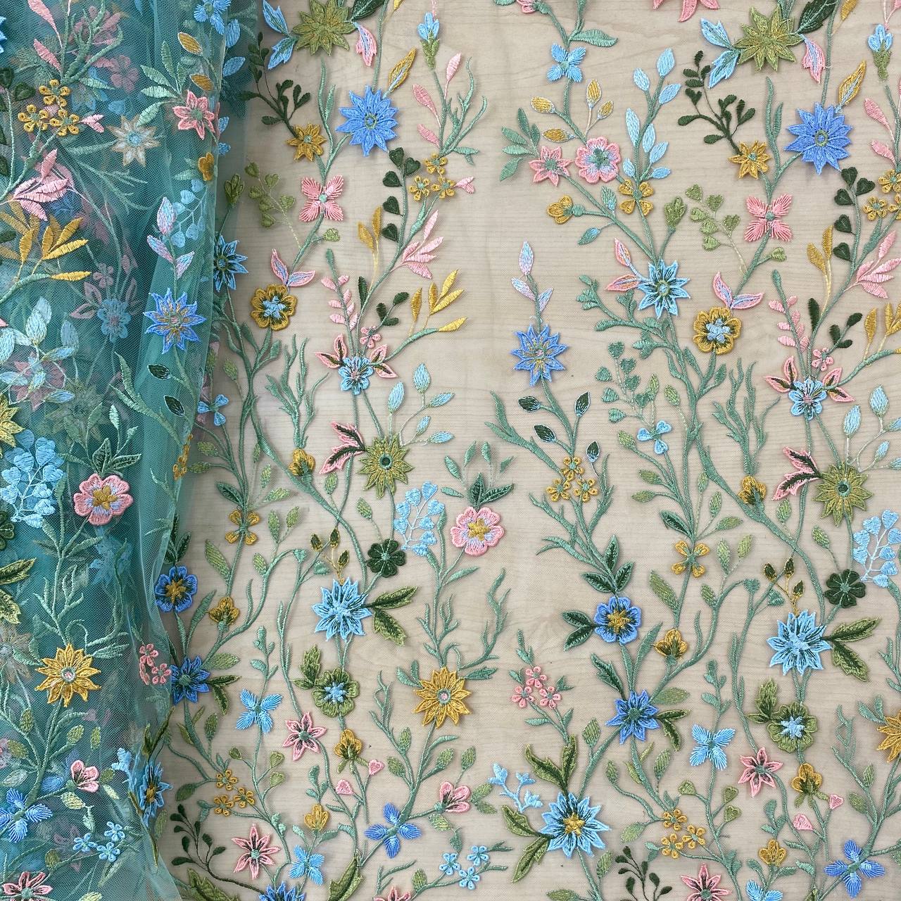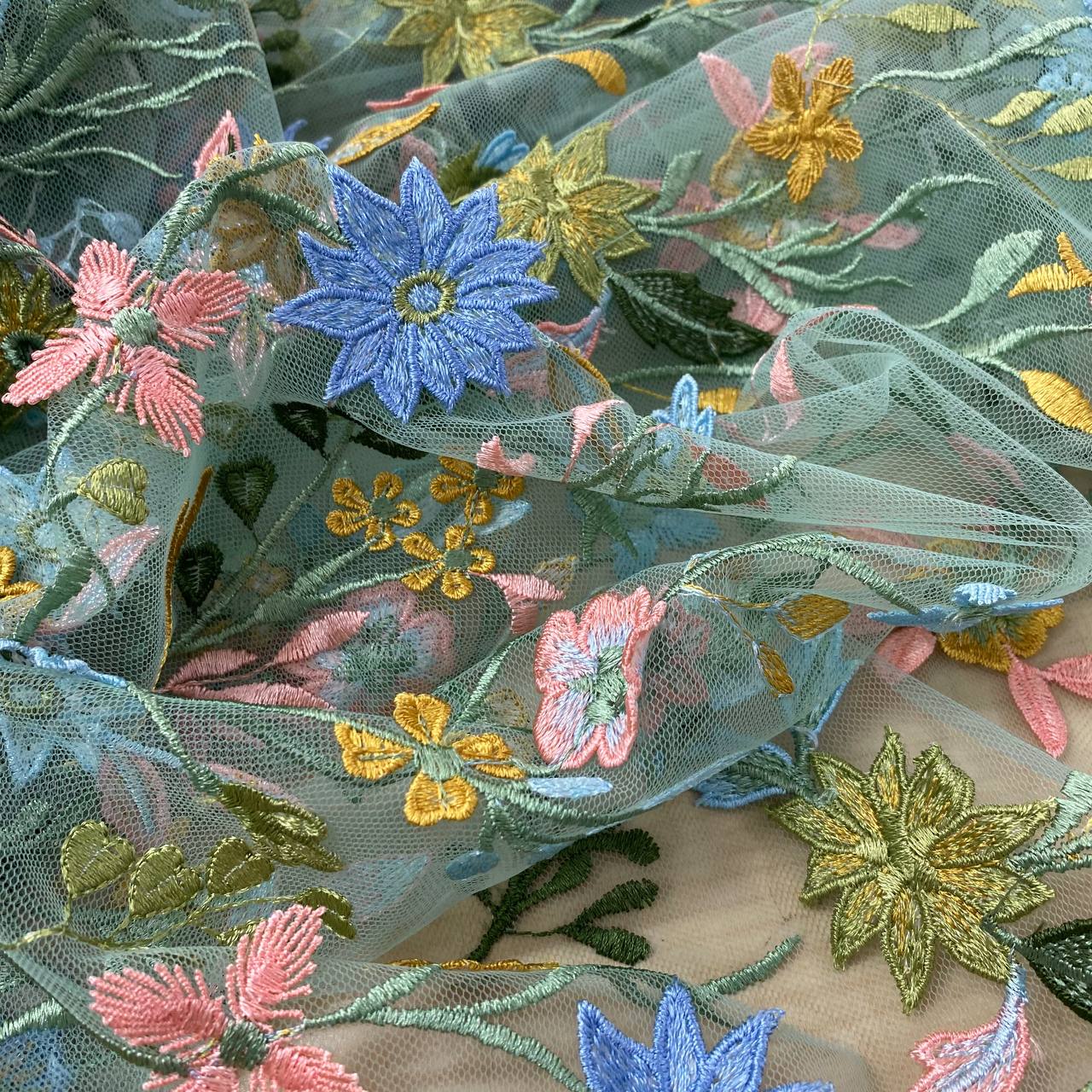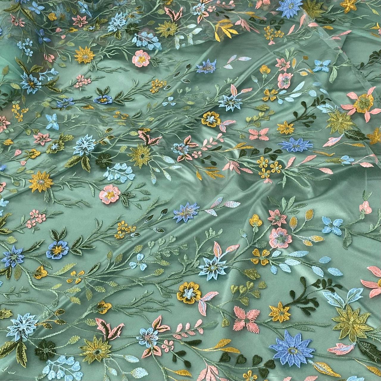 בד תחרה רקום על טול ירוק מנטה בהיר עם פרחים תלת מימד,