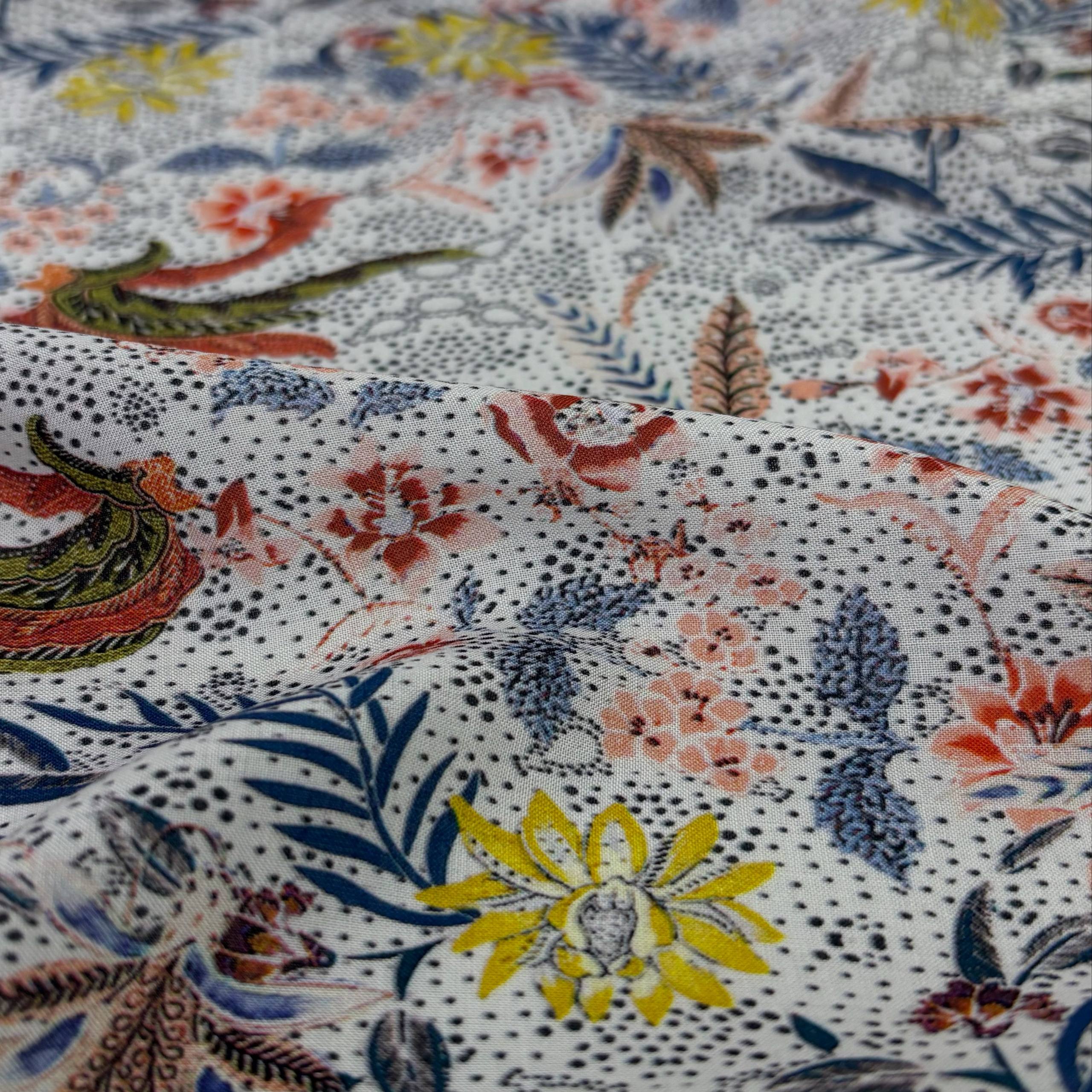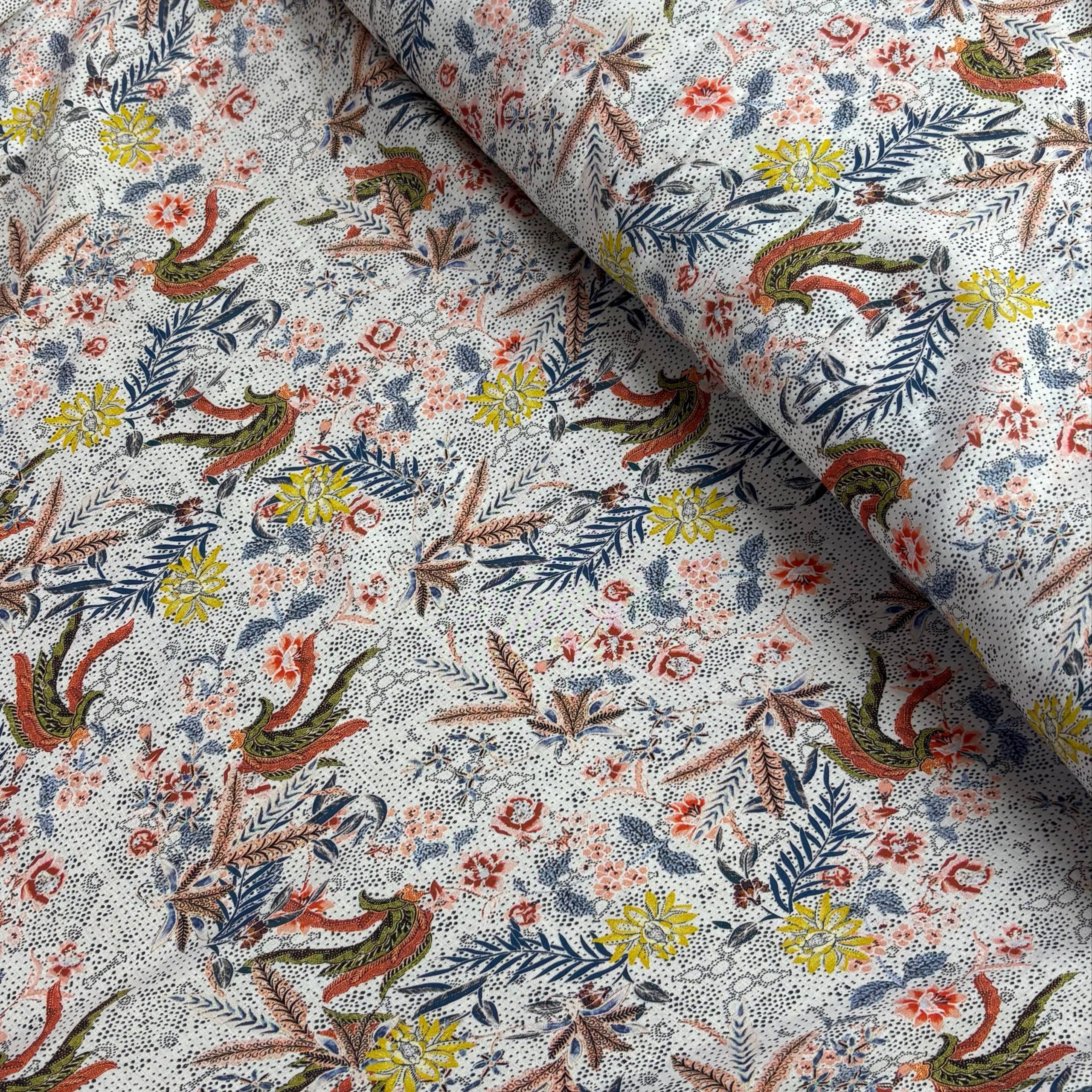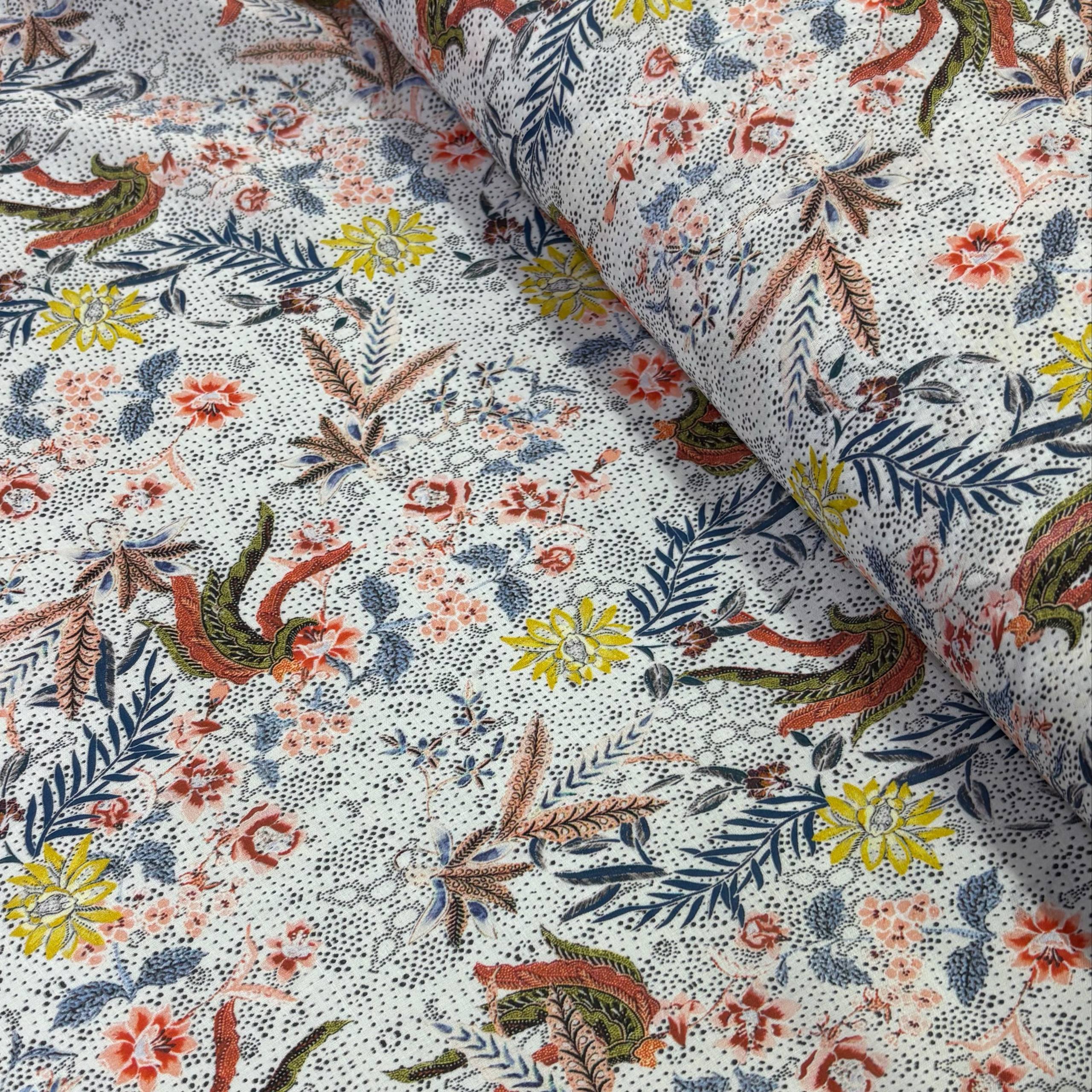 הדפס פרחים ועלים בצבעים שונים – כתום, כחול, צהוב, ירוק, נקודות שחורות על רקע לבן