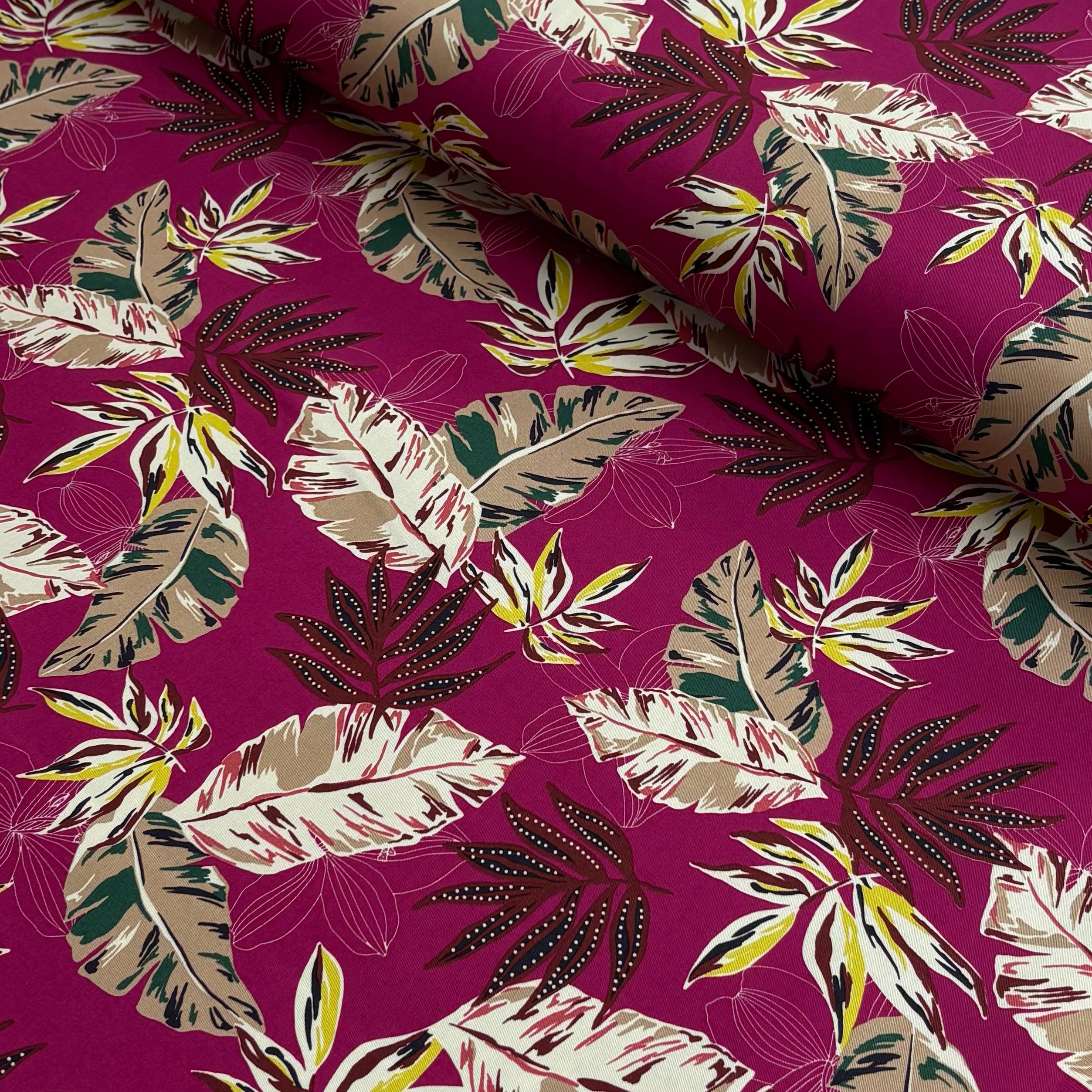 בד כותנה לייקרה עלים בז בורדו ורוד פוקסיה