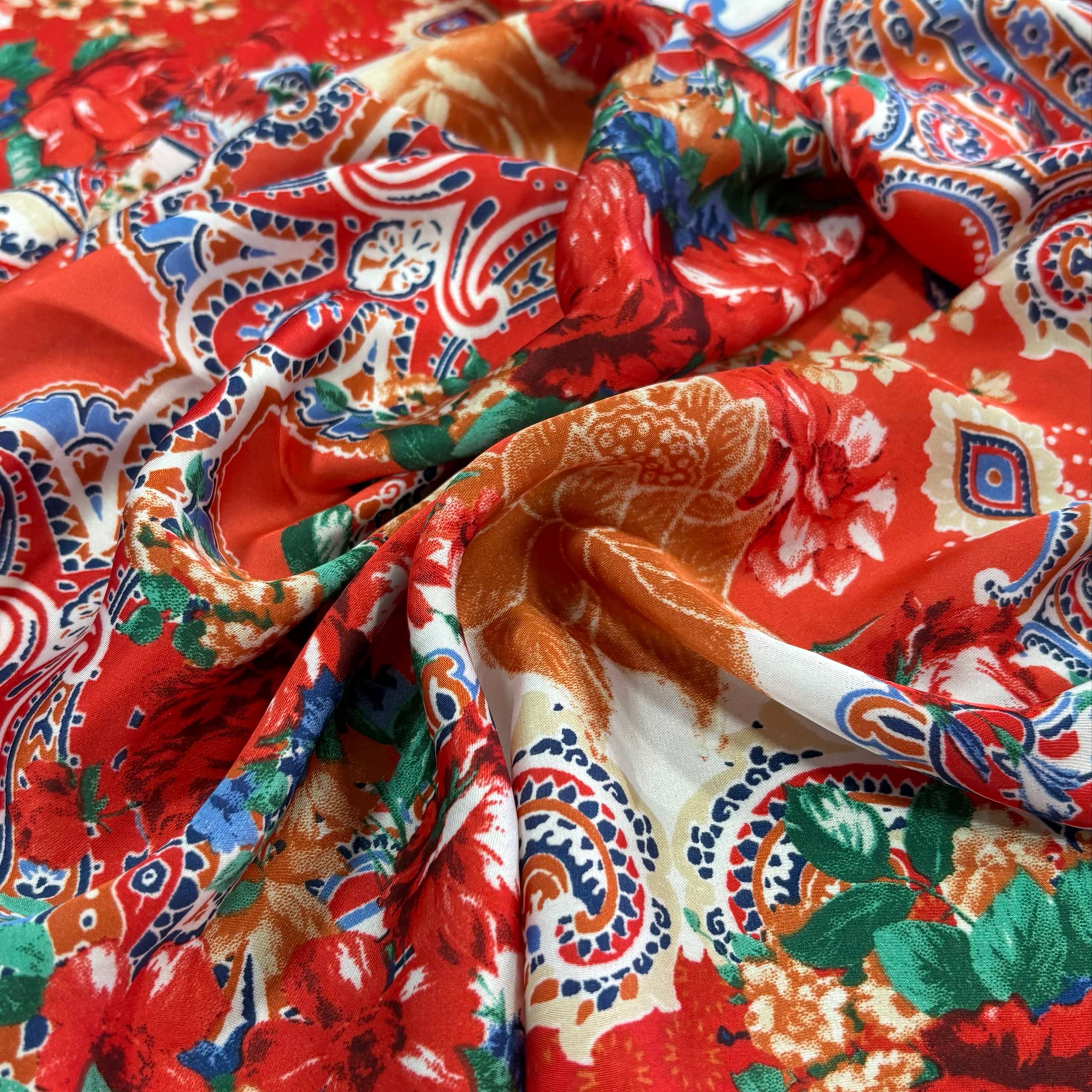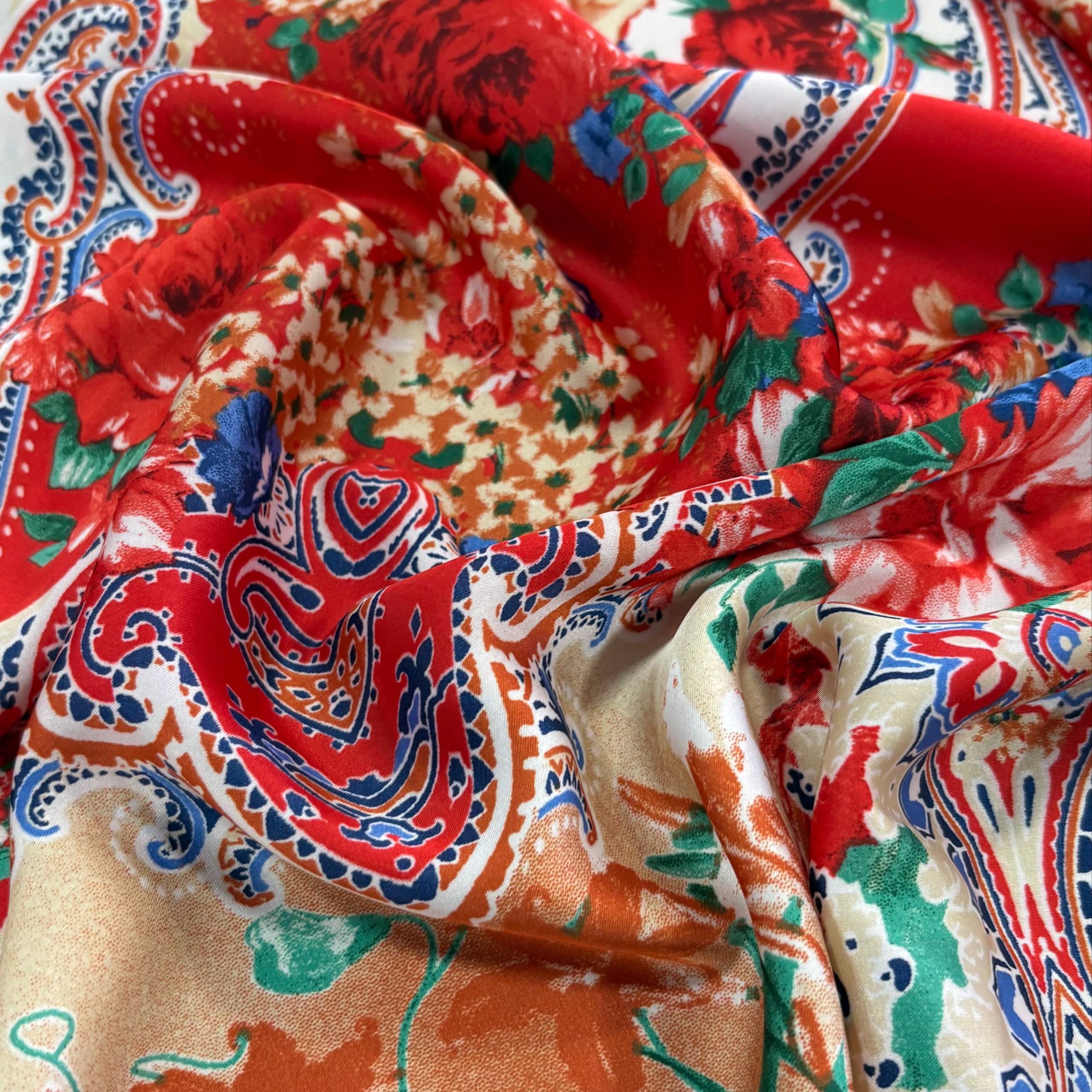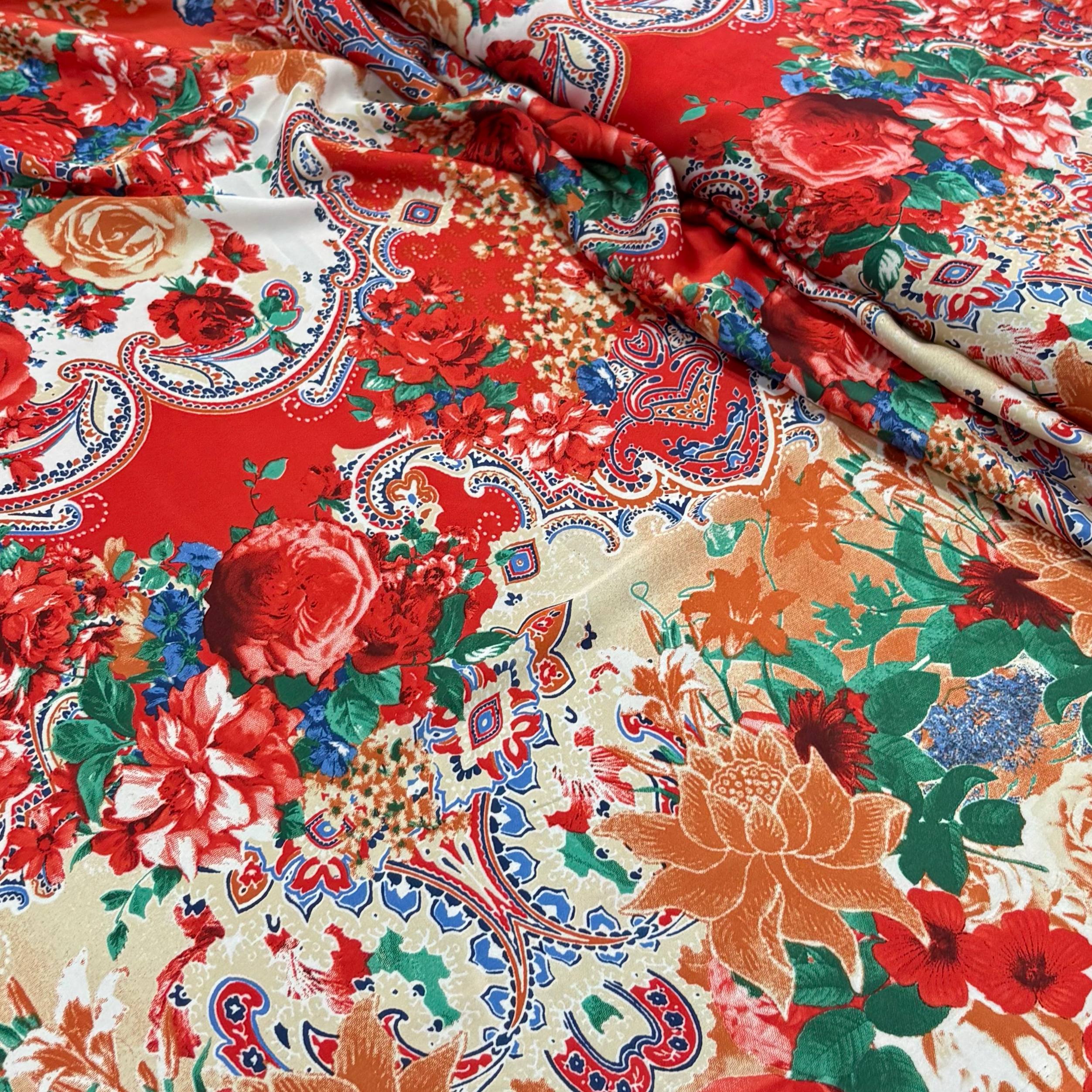 בד סאטן דמוי משי פרחים אדום