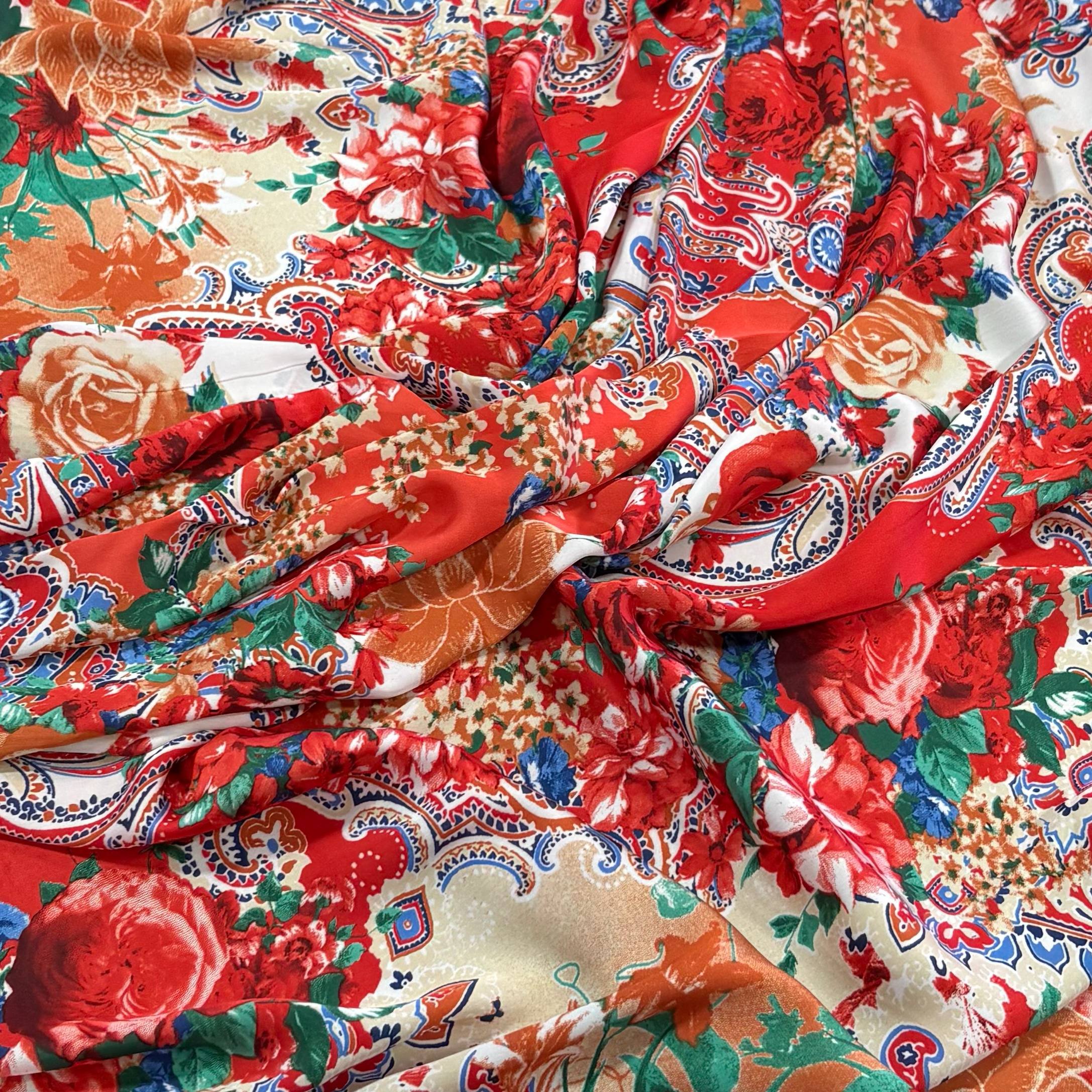 הדפס פרחוני עם עיטורים בצבע אדום, ירוק, כתום ועוד