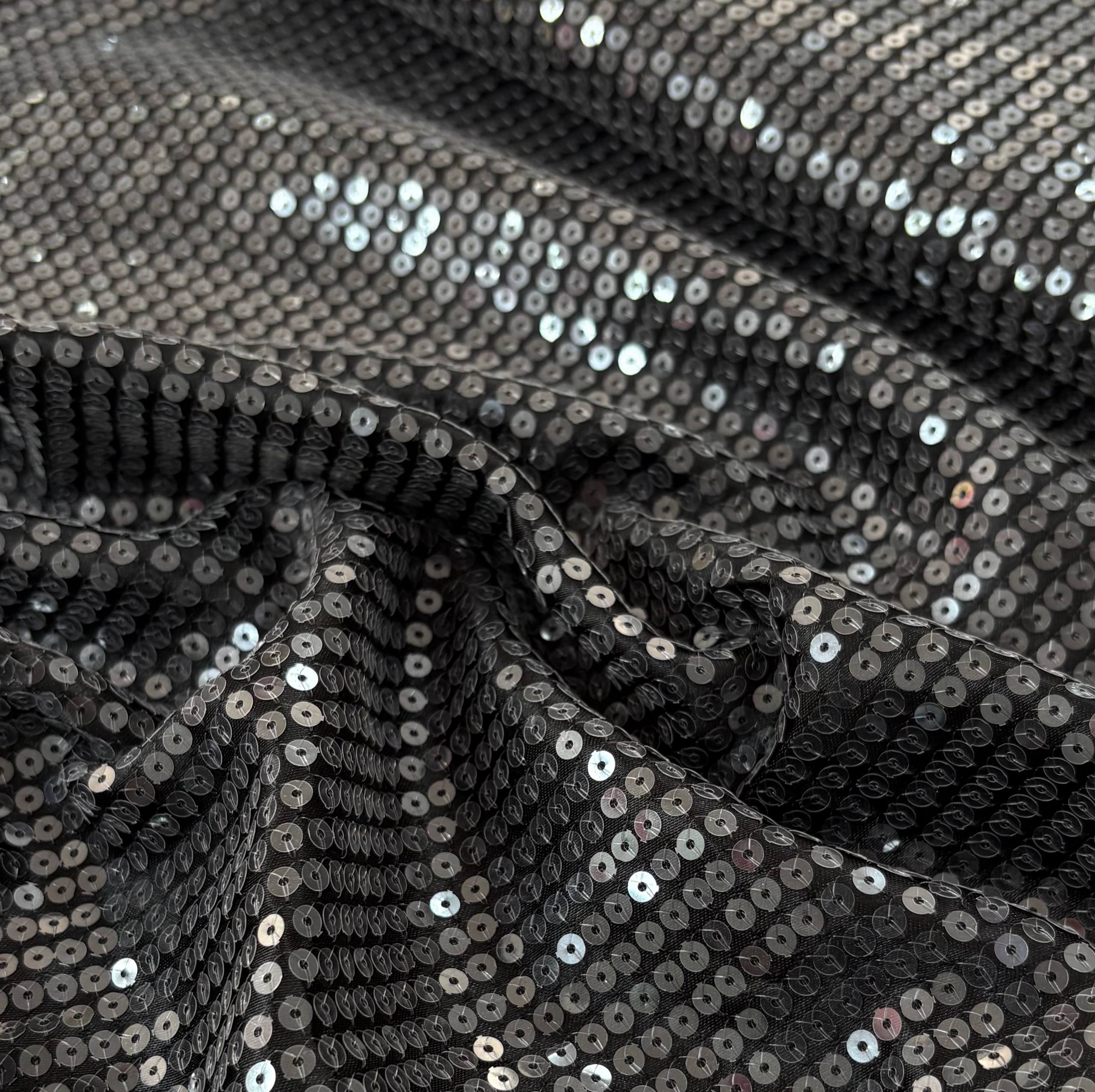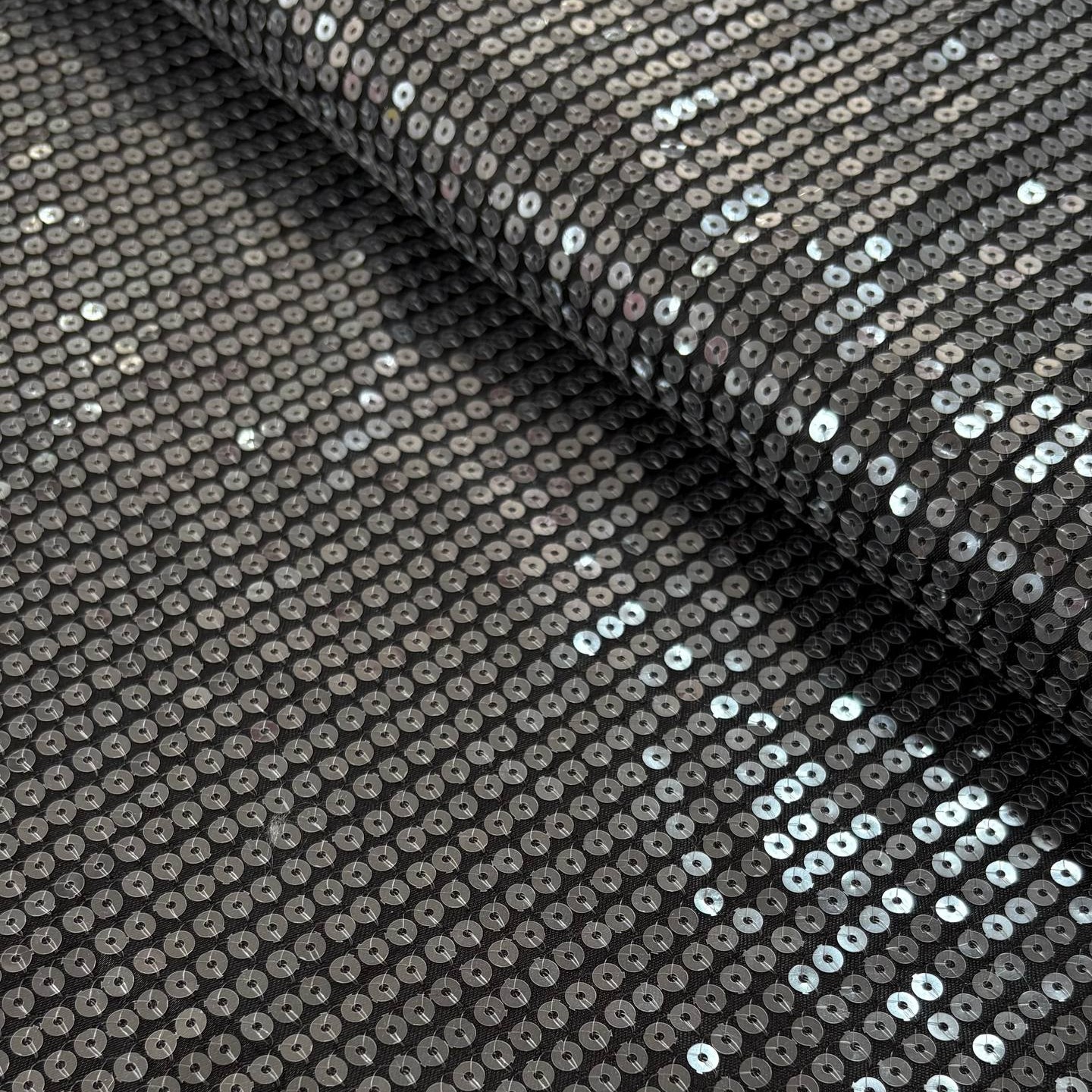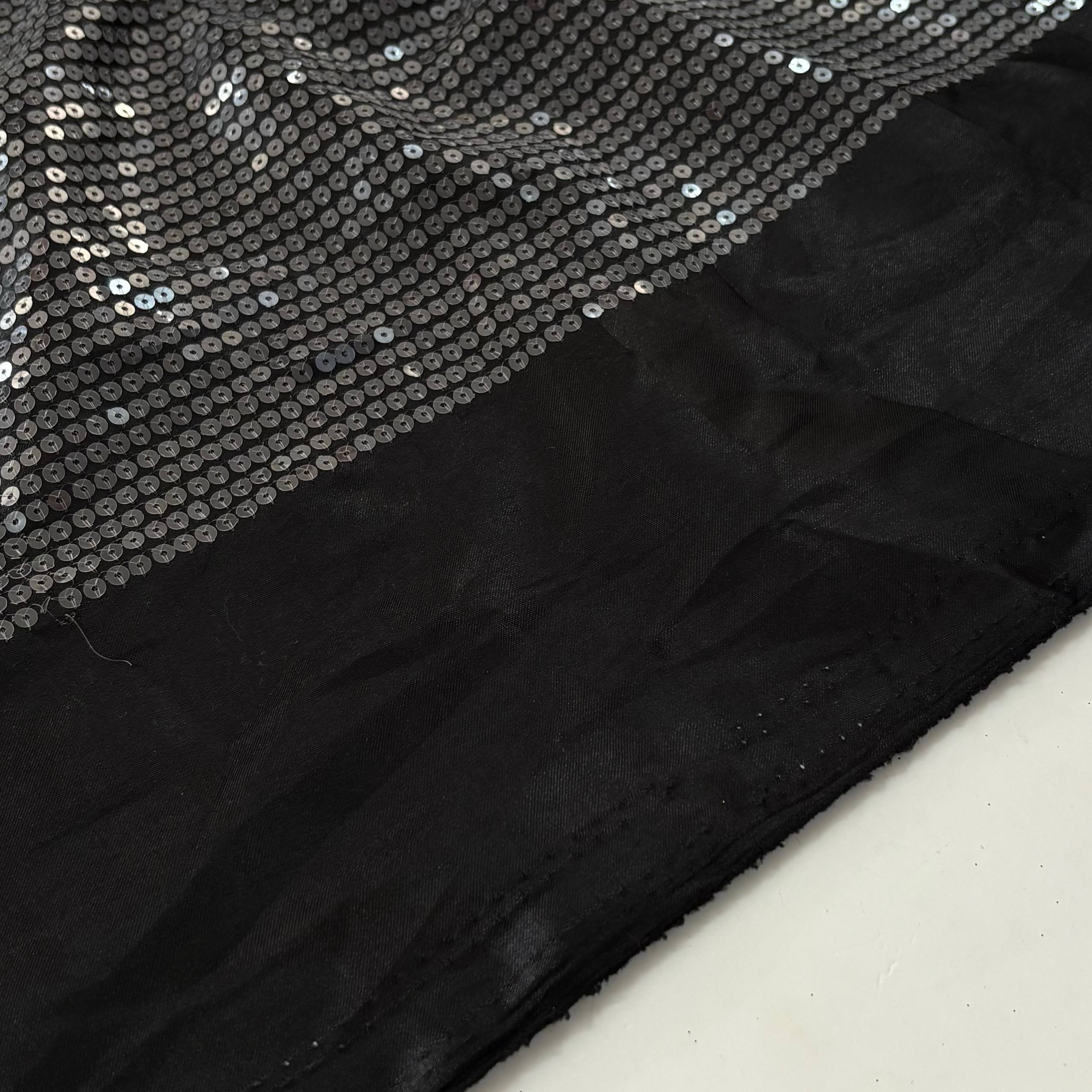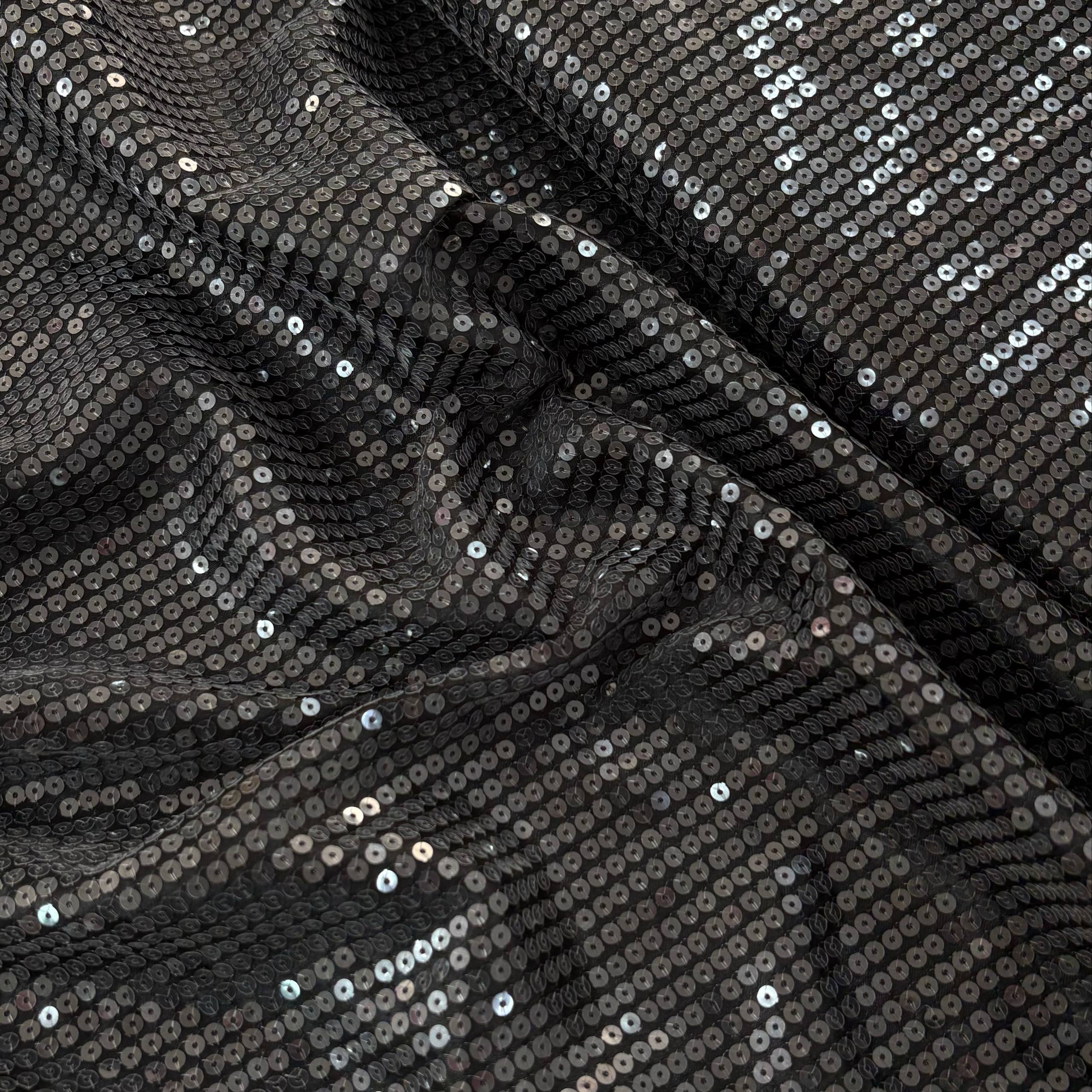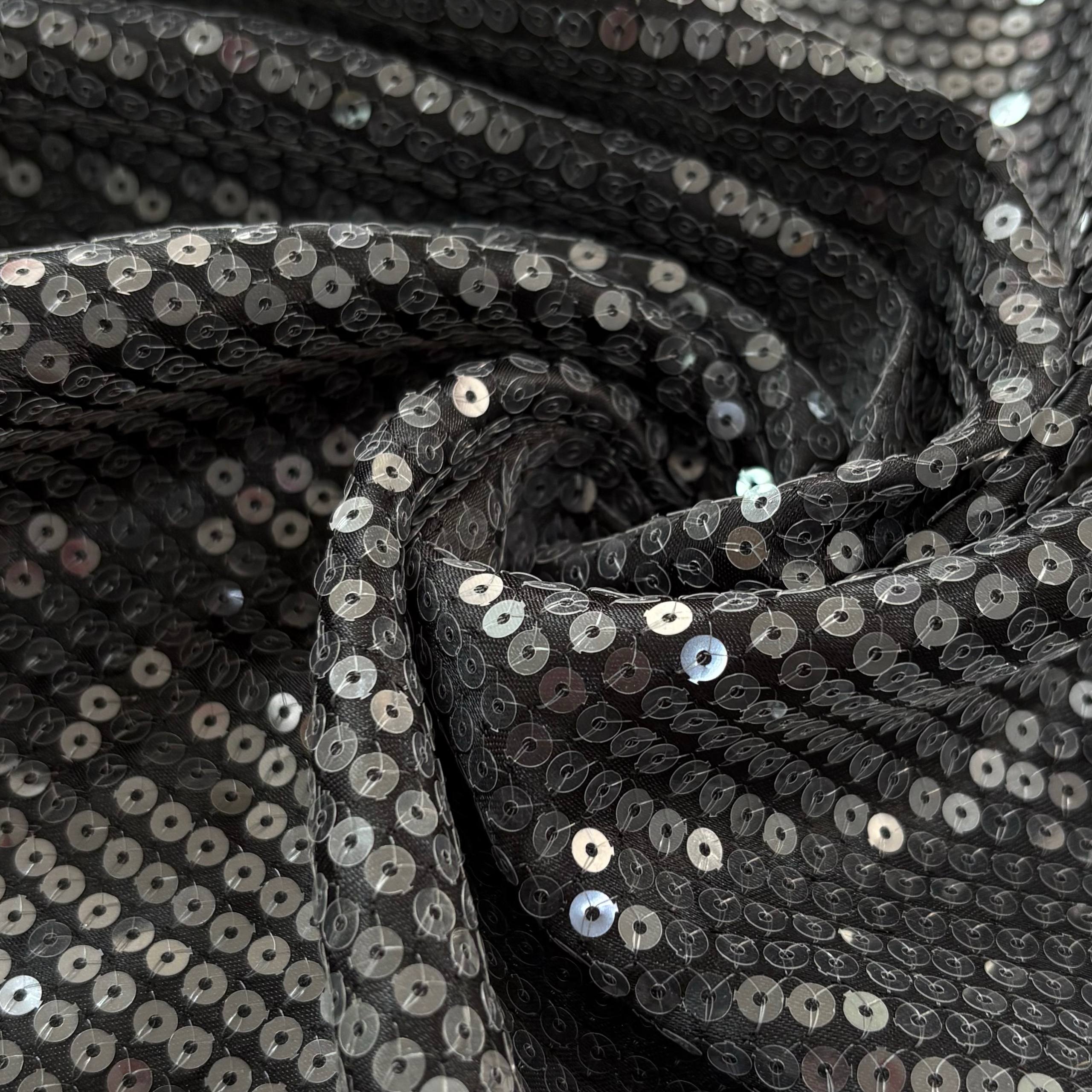 פייטים עגולים שקופים תפורים על בד סאטן שחור