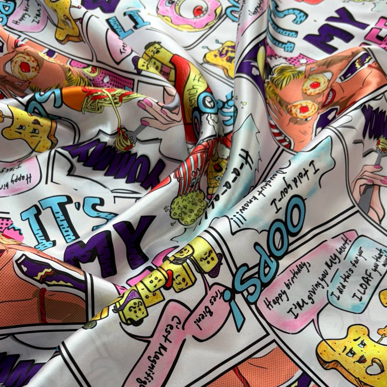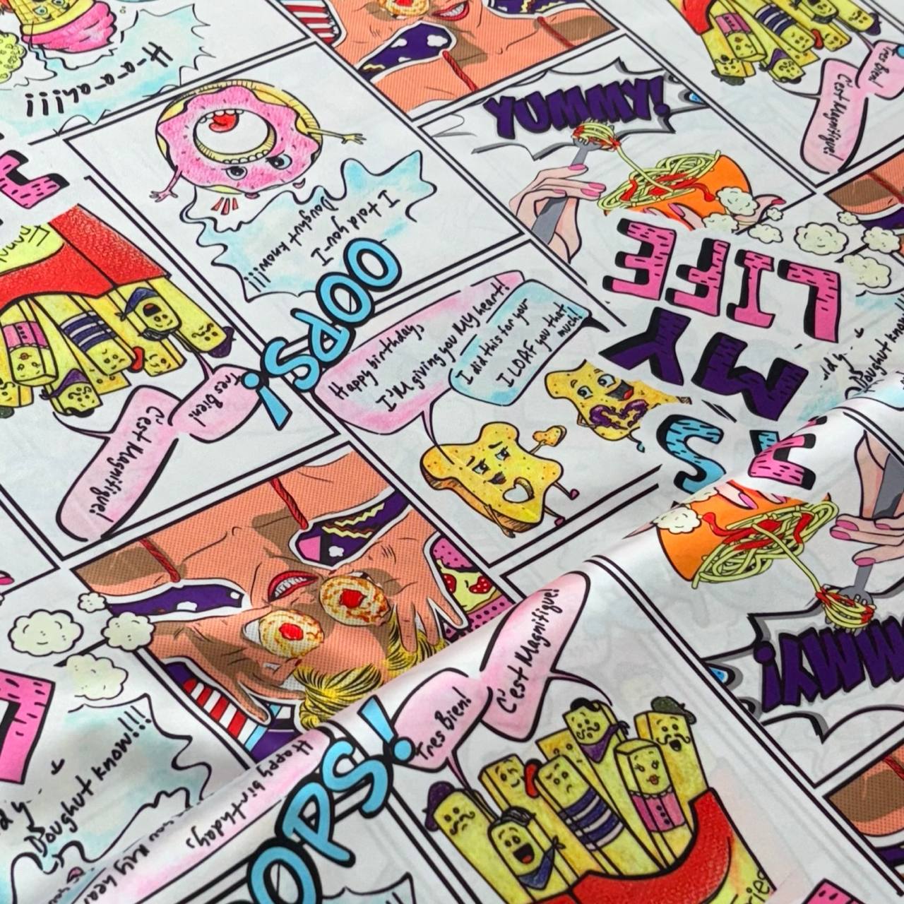 בד דק וצבעוני עם הדפס אוכל – דונאטס, פופקורן ועוד