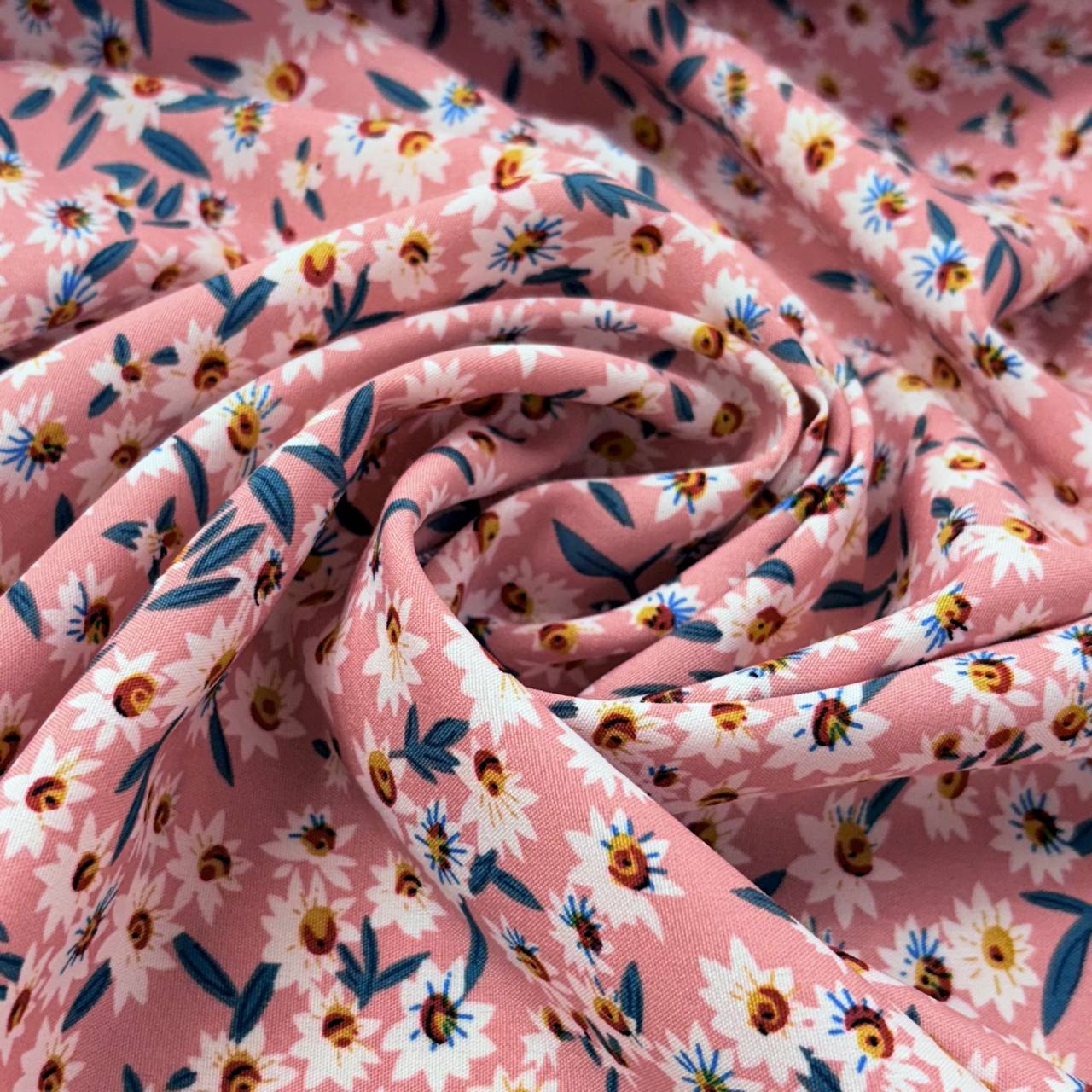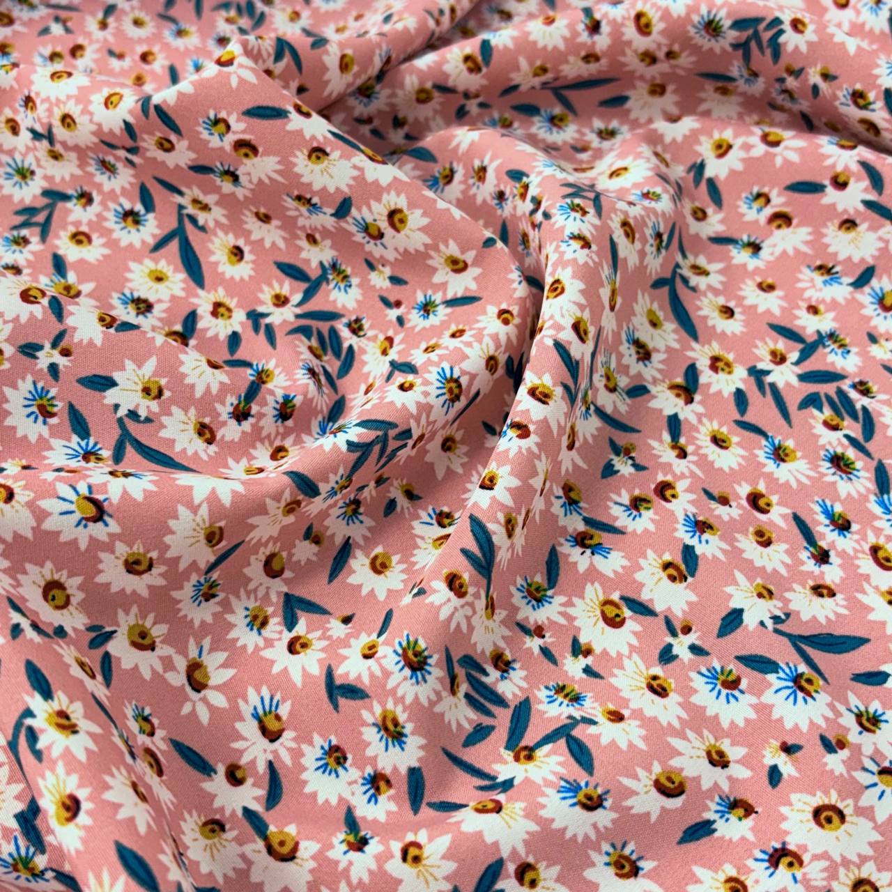 בד במראה ויסקוזה, הדפס פרחים לבנים ועלים כחולים על רקע ורוד אפרסקי