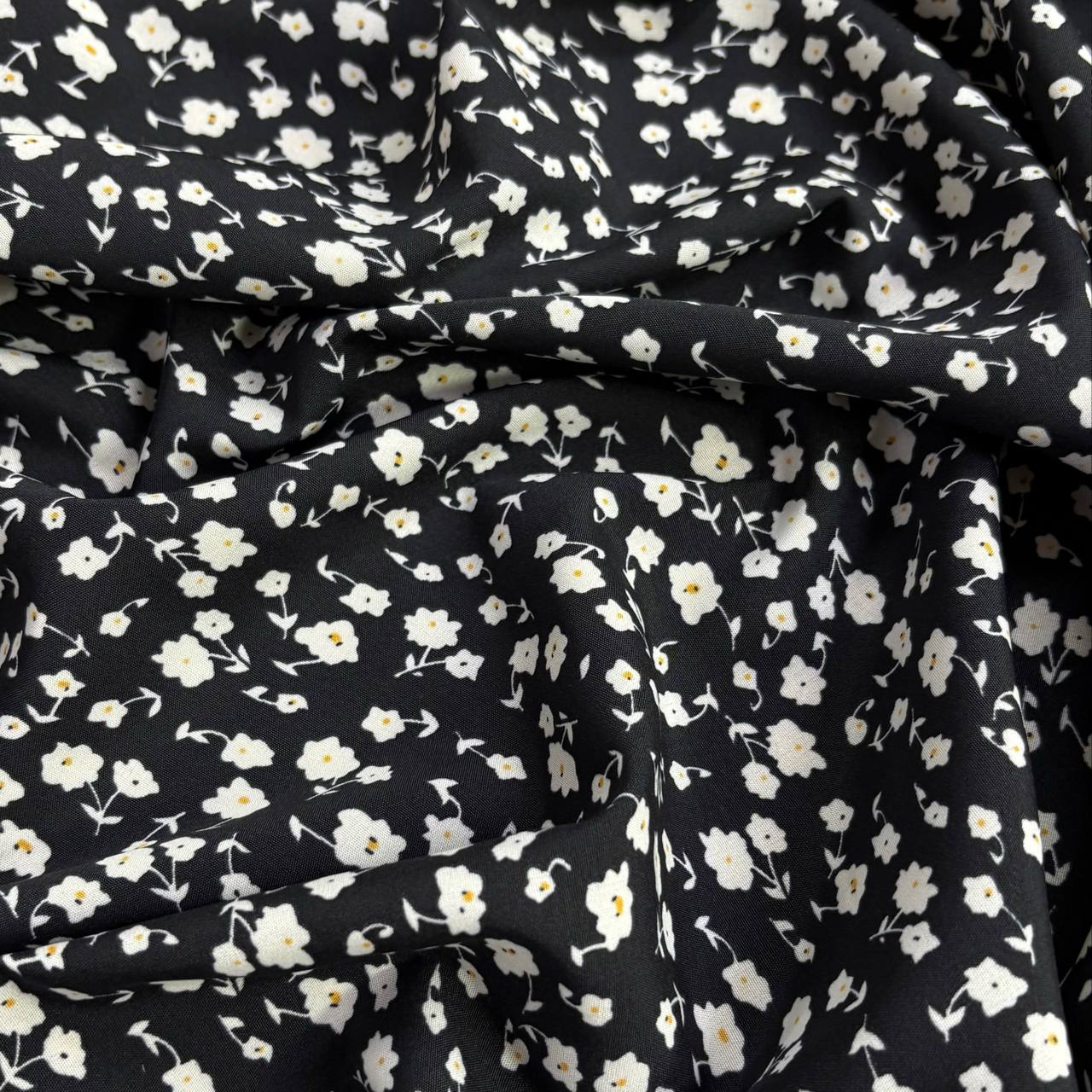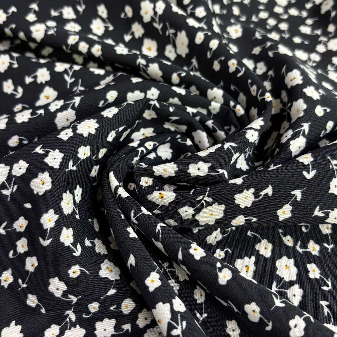 בד במראה ויסקוזה, הדפס פרחים לבנים על רקע שחור