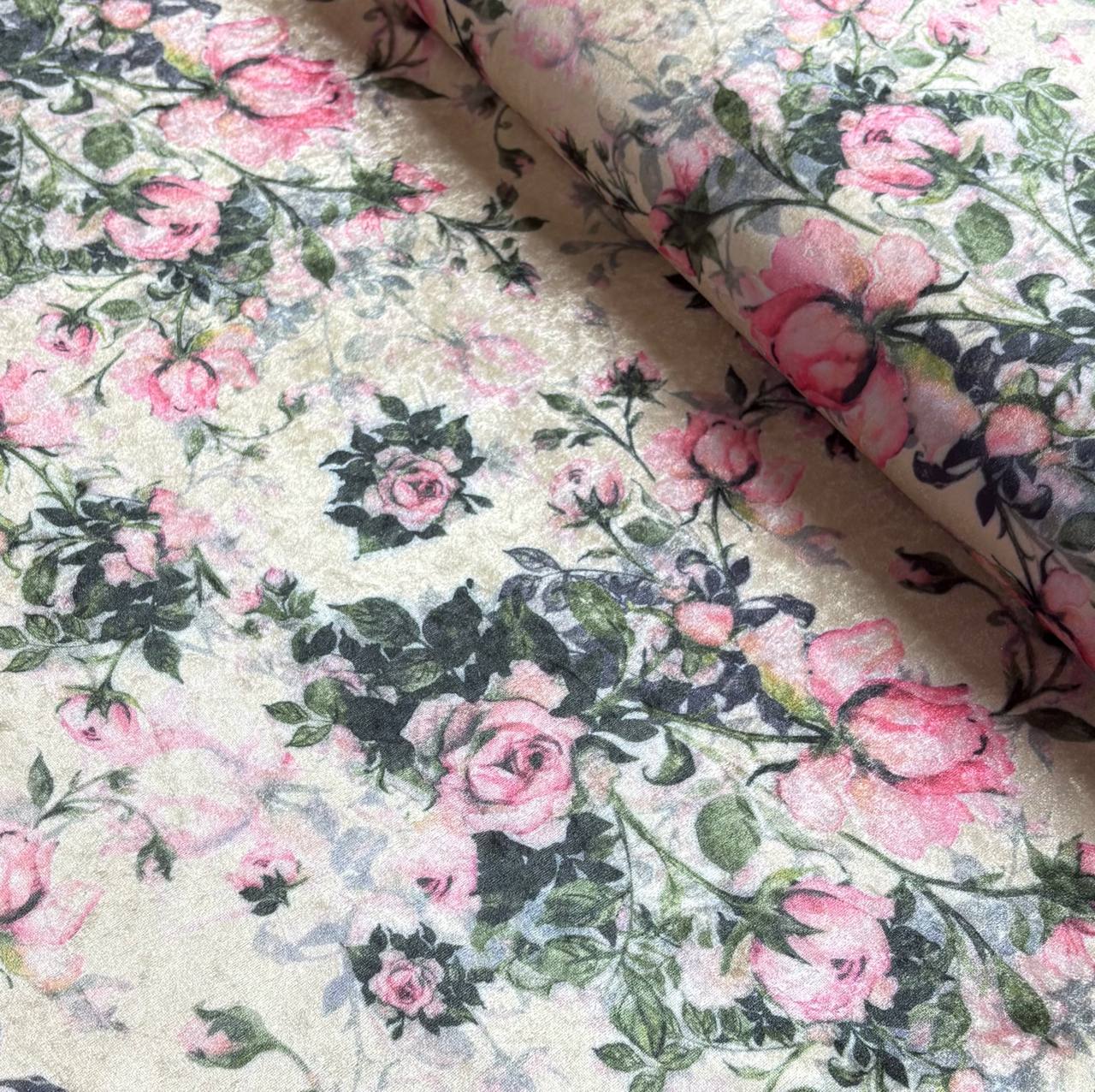 קטיפה מהממת עם הדפס פרחוני על רקע צבע בהיר בסגנון וינטג רטרו
